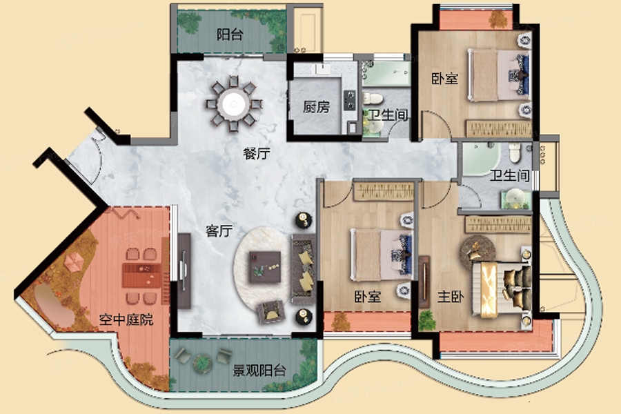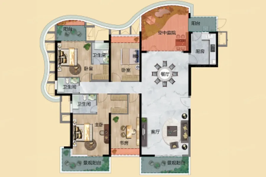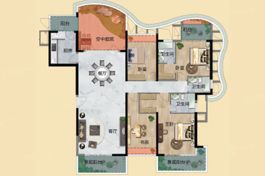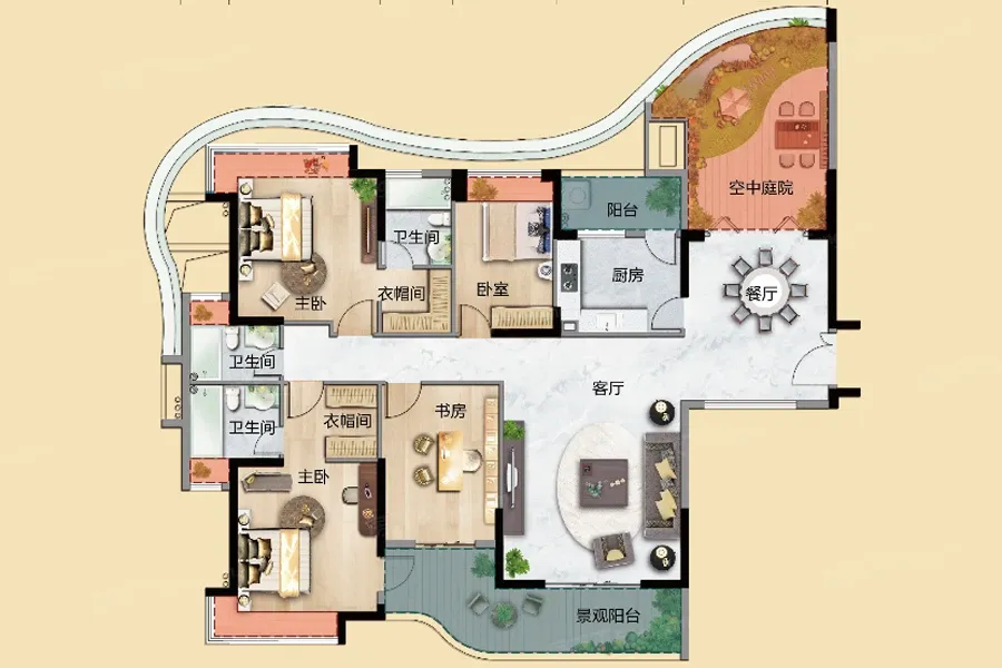 项目由4栋高层住宅组成,仅295席大户产品,户户南向,每户尊享6.3米高的空中庭院与270°城市景观面,享受自在的私属领地。创新优美弧线外立面结合独有室外客厅,突破了城市钢筋水泥的建筑,成为城央一道亮丽的建筑风景线,小区结合坡地布局创造“之”字形坡地式园林,打造四重园林景观,开启院落生活。小区内设有共1380㎡主题式架空层会所,足不出园即可享受与家人朋友的天伦之乐。